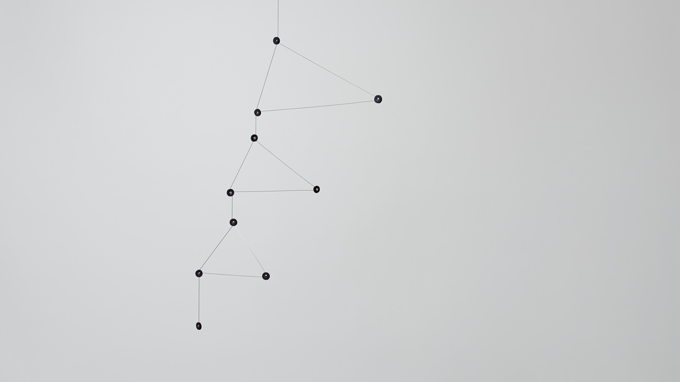 天井から降りる1本の糸に「V」の形状をした3つのパーツを取り付けることで完成するモビールです。パーツの重みで糸がカクンと折れ曲がり、全体が角度をもったラインとなって現れます。重力をそのままカタチにした、そんなモビールです。