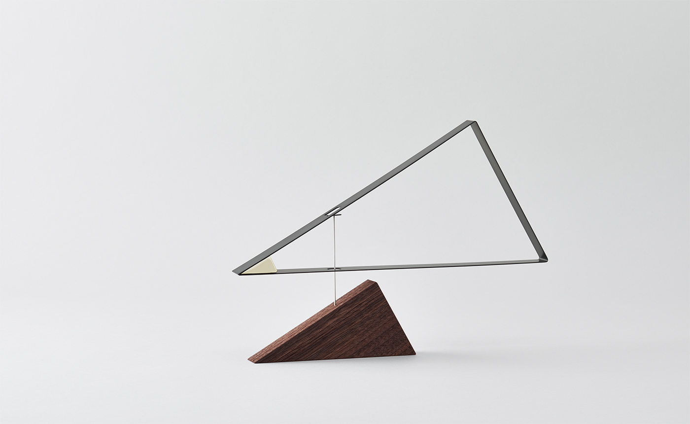 このモビールは3つの三角形でできています。アルミニウムフレームは最も大きく最も軽いパーツです。小さなスチールのブロック(塊)は全体のバランスを保ち、ウォルナット製のウッドベースがフレームとブロックの両方を支えています。パーツの三角形の比率は全て同じ。異なる素材の三角形がつくるリズムとバランスは、あたかも洋上を航海しているかのような柔らかでおだやかな時を創造します。
